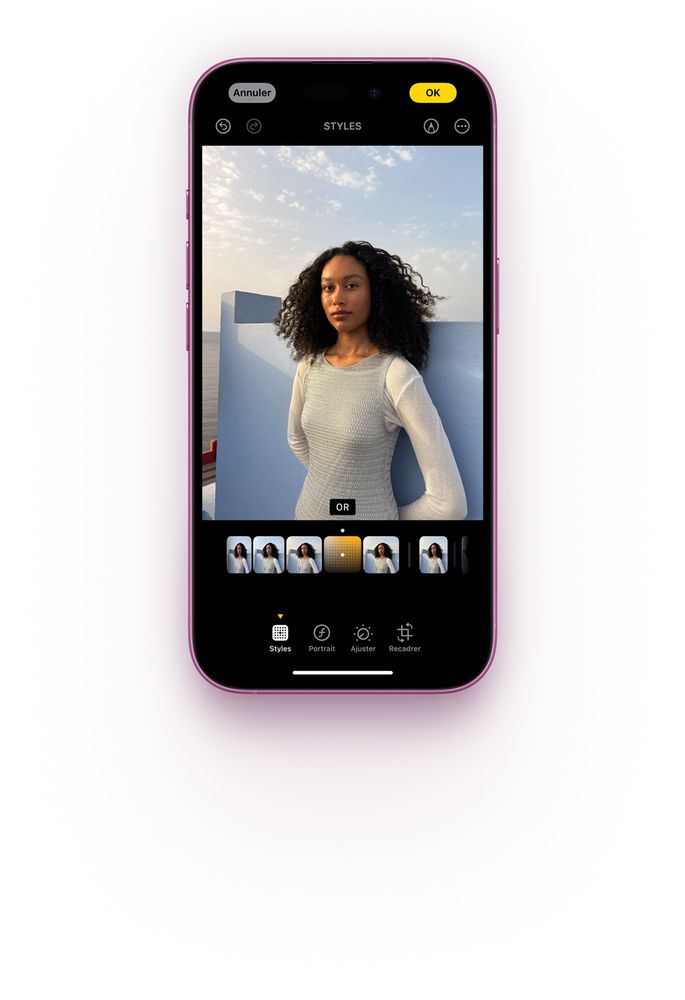 Les nouveaux styles vous permettent d'obtenir un rendu des teints de peau encore plus avancé pour définir avec précision le look que vous souhaitez. Vous pouvez appliquer ces réglages à l'ensemble de vos photos. Et grâce à la puissance de la puce A18, vous visualisez le changement en direct avant de l'appliquer.