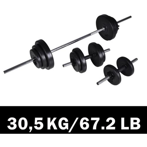 Cet ensemble d'haltères avec disques de poids vous permettra d'effectuer une grande variété d'exercices plus facilement et en toute sécurité à la maison ou au gymnase. Cet ensemble ergonomique comprend 1 haltère, 2 haltères et 12 disques de poids, poids total 30,5 kg, y compris les barres. L'ensemble d'haltères à des barres chromées avec des colliers élastiques à action rapide (barre d'haltères), poignées antidérapantes et croisillons cannelés vis des capuchons (barre d'haltères) pour une fixation sûre des disques de poids. Vous pouvez vous entraîner séns vous soucier des problèmes de sécurité. Les disques de poids sont fabriqués avec un boîtier en PE robuste. Ils peuvent être combinés de différentes manières pour différents objectifs de formation. La livraison inclut 1 barre d'haltères, 2 barres d'haltères, 6 disques de poids de 1,25 kg, 4 disques de 2,5 kg, 2 disques de 5 kg, 4 colliers en plastique et 2 clips. Taille de la poignée : env. 14,5 cm (barbell), 10 cm (haltère) Disque de poids : coulée de polyéthylène Barre d'haltères : 2,5 cm, longueur 140 cm, 2 kg Barre d'haltères: 2,5 cm, longueur 45 cm, 0,5 kg Disque de poids de 1,25 kg : 17,5 cm, épaisseur 3 cm Disque de poids de 2,5 kg : 22 cm, épaisseur 4 cm Disque de poids de 5 kg : 27 cm, 4,5 cm d'épaisseur Poids total y compris les barres : 30,5 kg Poids total des disques : 27,5 kg