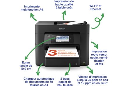 L'imprimante EPSON WorkForce WF-4830DTWF se distingue par sa capacité à répondre aux exigences des professionnels et des travailleurs à domicile. Avec des vitesses d'impression allant jusqu'à 25 ppm en noir et blanc et 12 ppm en couleurs, ce modèle garantit une efficacité remarquable. La technologie PrecisionCore assure des impressions de qualité laser, tandis que le chargeur automatique de documents de 50 pages A4 optimise la gestion des tâches multiples. L'impression Recto Verso, la numérisation et le fax jusqu'au format A4 complètent le tableau pour une multifonctionnalité sans faille.