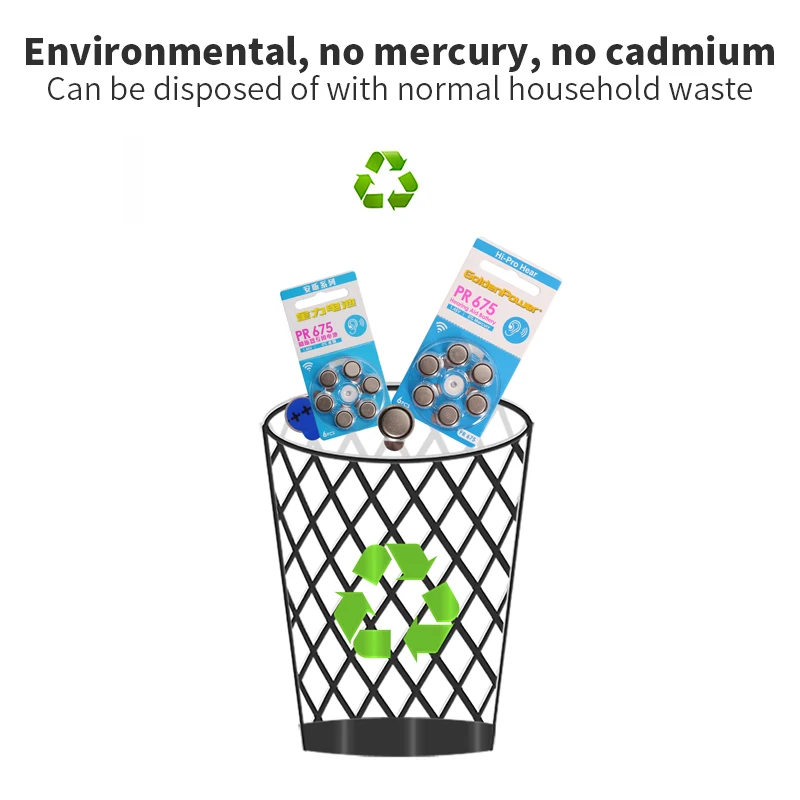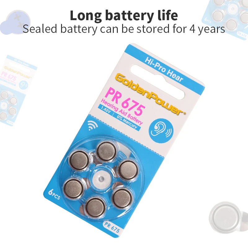 CaractéristiqueBatterie d'aide auditive professionnelleEnvironnemental, sans mercure, sans cadmiumPeut être jeté avec des déchets ménagers normauxExcellente technologie anti-fuite de batterie. Plus sûr, plus économiqueLongue durée de vie de la batterie: la batterie scellée peut être stockée pendant 4 ansRemarquéNe pas déchirer le joint derrière la batterie lorsqu'il n'est pas utilisé.Il n'y a pas d'effet d'étanchéité même s'il est arraché puis renvoyéLe paquet contient (facultatif)1 boîte (60 pièces) batteries scelléesTaille: A10/PR10A13/PR13A312/PR312A675/PR675