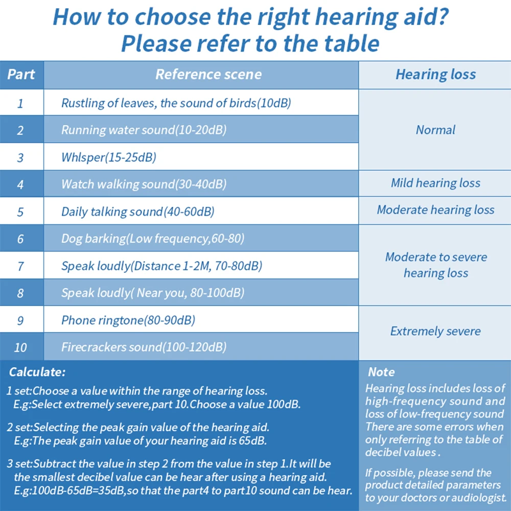 1. Gain de crête (dB): 45dB, adapté à la perte auditive légère à modérée (carte de perte auditive de référence)